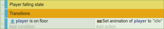 Instead of the animation, we could have created here a dedicated Scene Variable "state" to control the player state. This is more advanced but allows for better flexibility. However, the approach presented here has the benefit of bundling the logic with the corresponding animation, allowing for clarity and simplicity in the event sheet. Furthermore, you have access to the frames of the current animation/state and can trigger some logic at a certain frame inside the animation.